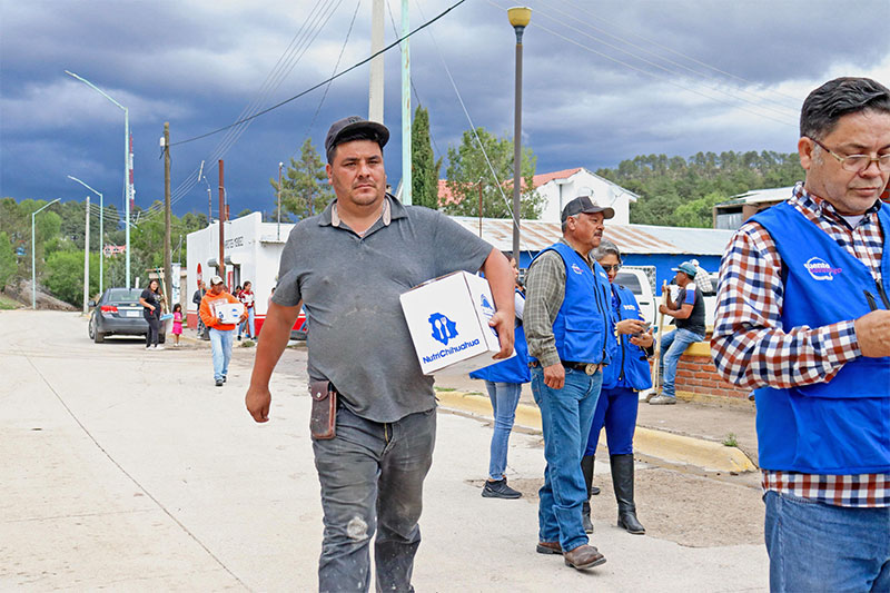Durante su visita, acompañado del presidente municipal de Bocoyna, Macario Hermosillo Pompa, entregó 150 despensas, 50 pliegos de hule, 100 láminas, 100 polines y 50 kits de limpieza, para dotar a las familias de insumos básicos para su alimentación y la reparación de sus viviendas.