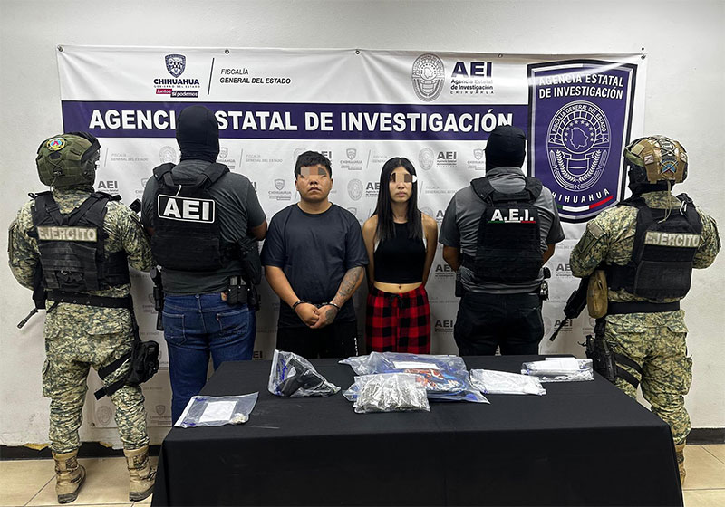 Elementos de la Agencia Estatal de Investigación adscritos al Centro de Operaciones Estratégicas (COE), detuvieron en flagrancia a quienes dijeron llamarse Gabriela Ivonne M.C. y Jairo H. T., por su probable responsabilidad en delitos contra la salud y posesión de arma de fuego de uso exclusivo del Ejército y las Fuerzas Armadas.