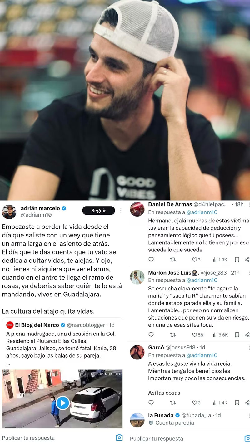 Al margen de la nueva información, Adrián Marcelo reaccionó al caso reflexionando sobre la normalización de la violencia. “Empezaste a perder la vida desde el día que saliste con un wey que tiene un arma larga en el asiento de atrás. El día que te das cuenta que, tu vato, se dedica a quitar vidas, te alejas. Y ojo, no tienes ni siquiera que ver el arma, cuando en el antro te llega el ramo de rosas, ya deberías saber quién te lo está mandando, vives en Guadalajara. La cultura del atajo quita vidas”, escribió.