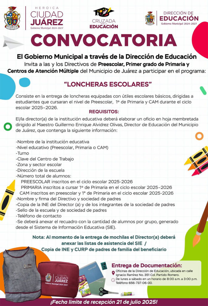 Guillermo Enrique Alvídrez Olivas, director de Educación del Municipio de Juárez, detalló que las loncheras están equipadas con útiles escolares básicos, los cuales se distribuirán entre estudiantes de preescolar, Centros de Atención Múltiple y exclusivamente primer grado de primaria durante el ciclo escolar 2025-2026.