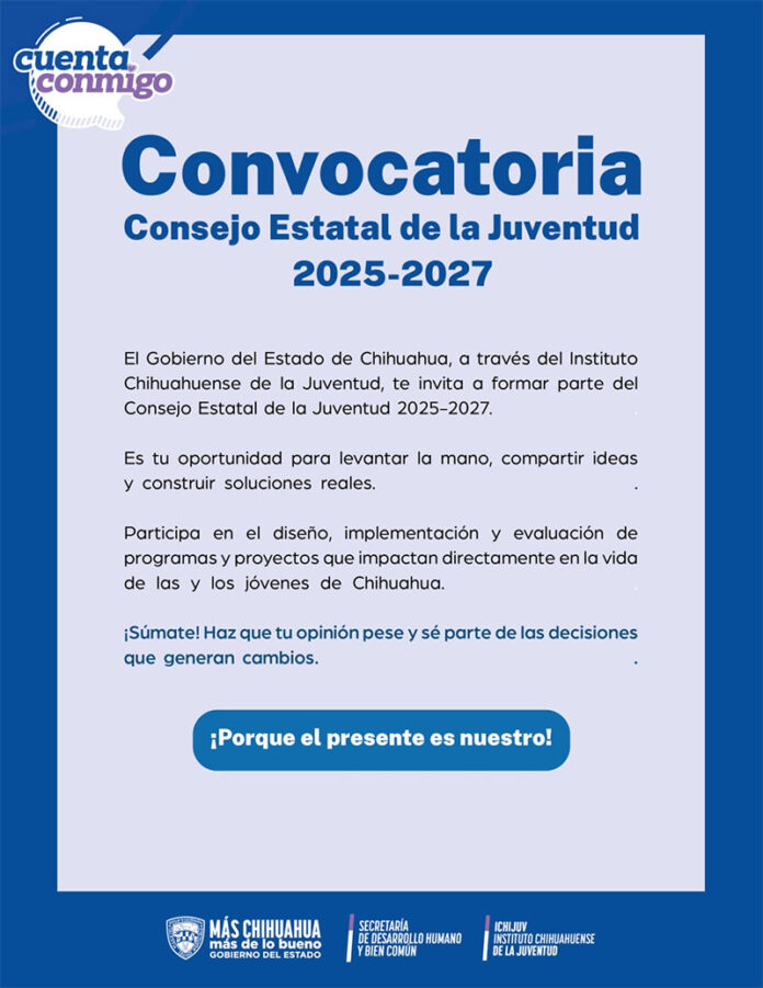 El Instituto Chihuahuense de la Juventud (Ichijuv), invita a las y los jóvenes de entre 12 y 29 años a participar en la convocatoria para integrar el Consejo Estatal de la Juventud 2025-2027.