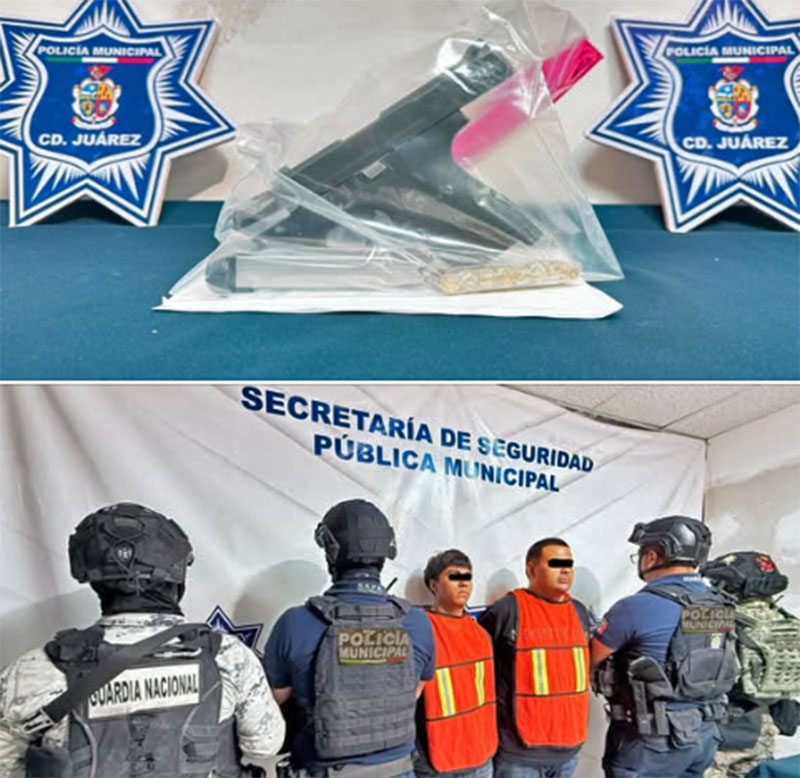 Elementos de la Secretaría de Seguridad Pública Municipal (SSPM), en coordinación con elementos de la Guardia Nacional y personal de la Defensa Nacional, capturaron a Mario Alberto Q. G. y a Jorge Alejandro S., por su presunta responsabilidad en la comisión de delitos contra la ley federal de armas de fuego y explosivos.