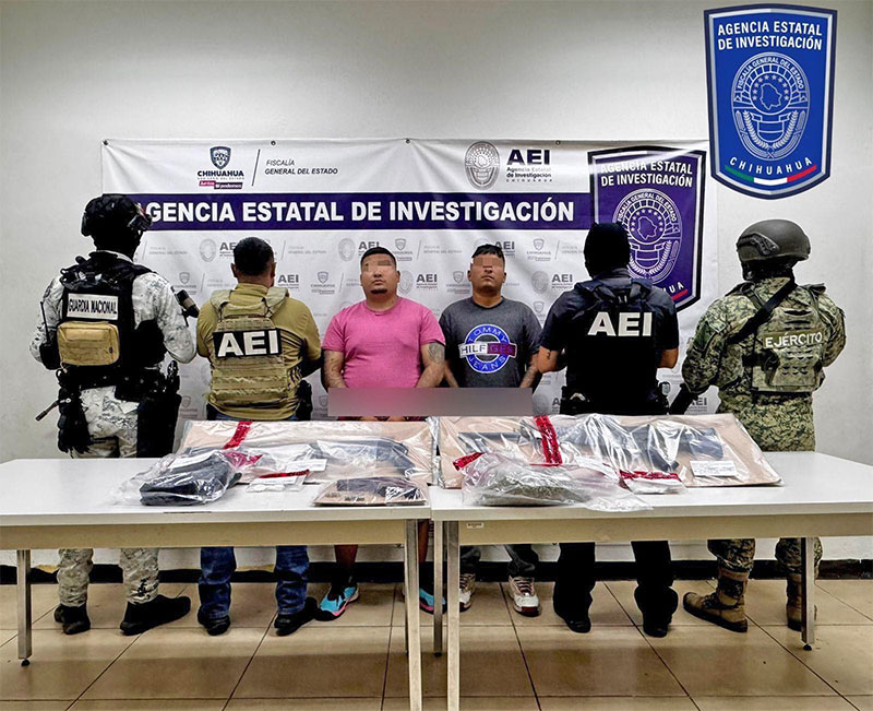 Elementos de la Agencia Estatal de Investigación, adscritos a la Fiscalía de Distrito Zona Norte, detuvieron a quienes se identificaron como, Ángel Jair O. R., y Samuel Alejandro O. R., por el delito de posesión ilegal de armas de fuego y delitos contra la salud, registrado en la colonia Renovación 92, en Ciudad Juárez.