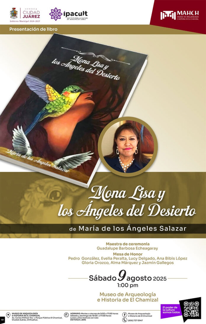El Instituto para la Cultura del Municipio de Juárez (IPACULT) invita a la ciudadanía a la presentación del libro “Mona Lisa y los Ángeles del Desierto”, de la escritora María de los Ángeles Salazar, que se llevará a cabo este sábado 9 de agosto a la 1:00 de la tarde en el Museo de Arqueología e Historia de El Chamizal (MAHCH).