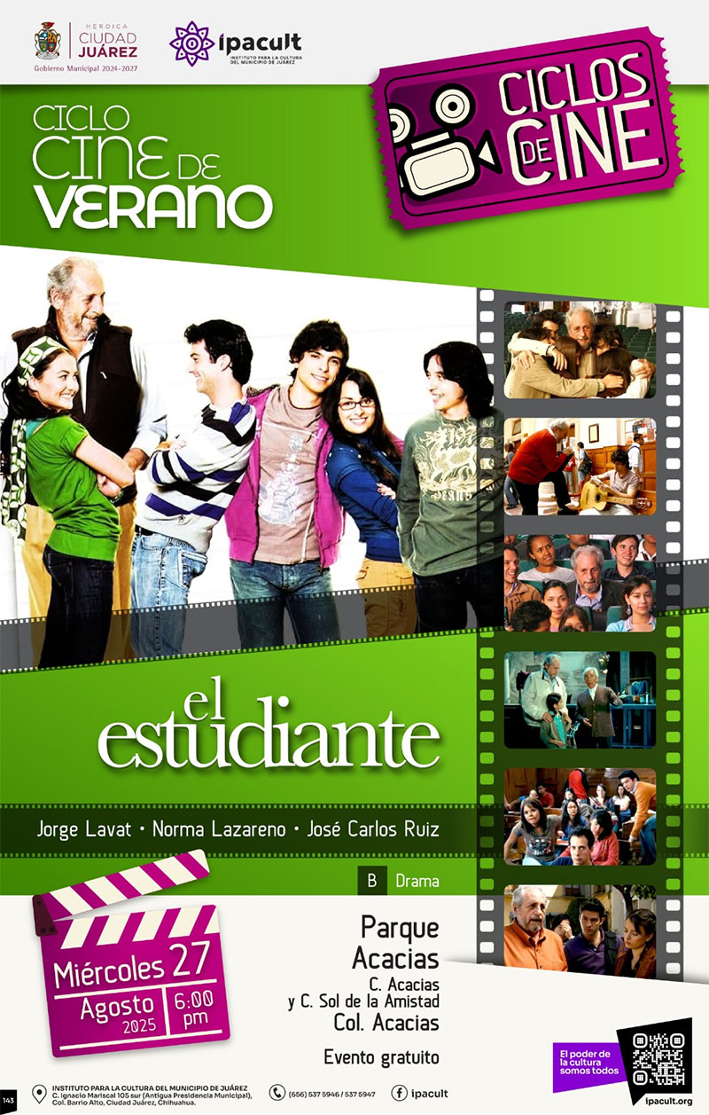 El Instituto para la Cultura del Municipio de Juárez (IPACULT) continúa con su misión de acercar el arte y la cultura a la comunidad y como parte de su programa “Ciclos de Cine”, este miércoles 27, en el Parque Acacias, se proyectará la película mexicana El Estudiante.