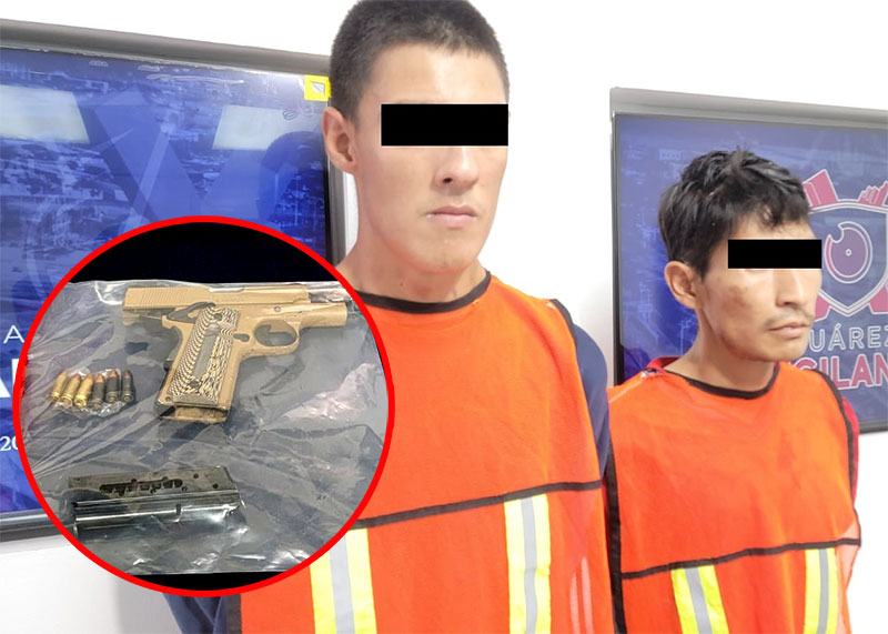 Elementos municipales adscritos al Distrito Sur, arrestaron a José Manuel H. M. y José Jesús S. R., por su presunta responsabilidad en la comisión de los delitos de robo de vehículo con violencia y violación a la ley federal de armas de fuego y explosivos.