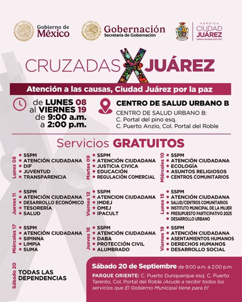 Este sábado 20 de septiembre de 9:00 de la mañana a 2:00 de la tarde en el Parque Oriente, ubicado en Puerto Tarento y Puerto Dunquerque, en la colonia Portal de Roble, se llevará a cabo el programa “Atención a las Causas, Ciudad Juárez por la Paz”.