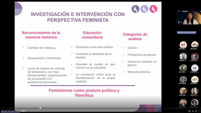 En este sentido, la encargada de Investigación, Angélica López Muñoz, y su equipo de practicantes llevaron a cabo la presentación del panel temático “Procesos de sensibilización para abordar la violencia feminicida, desaparición y violencias digitales a través de la educación comunitaria”.