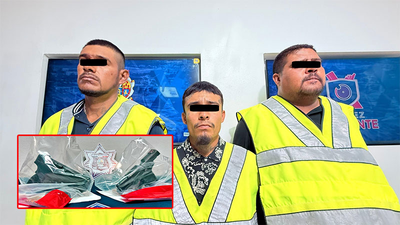 Elementos de la Secretaría de Seguridad Pública Municipal, adscritos a la Estación de Policía del Distrito Universidad, detuvieron a tres sujetos identificados como Gerardo M. E., Luis Alberto B. C. y Miguel Ángel R. R., por su presunta responsabilidad en la comisión del delito de homicidio en grado de tentativa y delitos contra la ley federal de armas de fuego y explosivos.