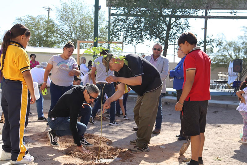 Como parte de las acciones para fortalecer el cuidado del medio ambiente y fomentar la educación ambiental en las nuevas generaciones, la Dirección de Parques y Jardines recibió la colaboración del Club Rotario Juárez y de la Fundación Grupo México en los trabajos de forestación y reforestación en la Escuela Primaria “José María Morelos y Pavón”.