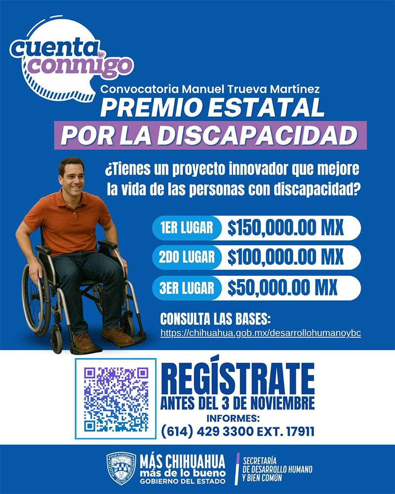 Dijo que la convocatoria está abierta para todas las personas físicas y morales que cumplan con los requisitos establecidos, y recordó que este premio forma parte de las acciones promovidas por el Consejo para la Inclusión y Desarrollo de las Personas con Discapacidad del Estado de Chihuahua.