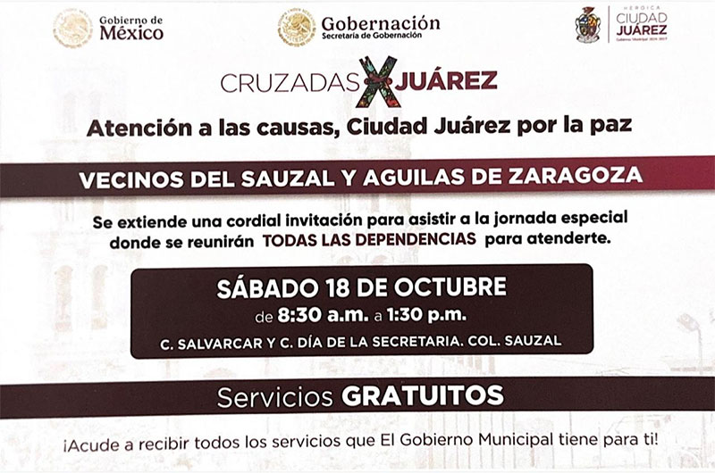“Será este sábado 18 octubre que estemos todos ofreciendo los servicios del Gobierno Municipal en el espacio situado en las calles Salvarcar y Día de la Secretaria, en la colonia El Sauzal, a las 8:30 de la mañana y hasta la 1:30 de la tarde”, señaló.