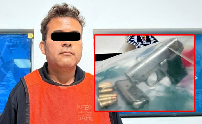 Al arribar al lugar, los oficiales fueron recibidos por la víctima, quien denunció haber sido agredida por su esposo, señalando además que este portaba un arma de fuego, por lo que, tras una inspección preventiva, se le localizó fajada a la altura de la cintura una pistola calibre .25, con un cargador abastecido con siete cartuchos útiles.