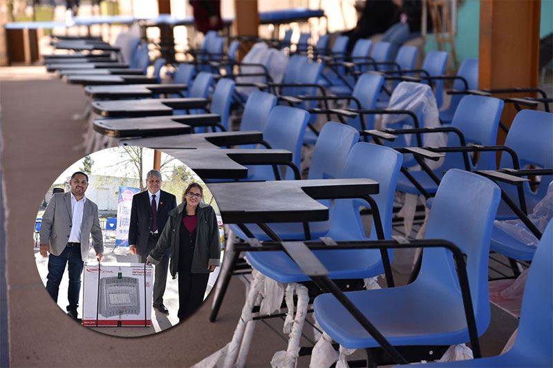 En esta ocasión se tuvo como sede la Escuela Aurelia Calderón de Escobar, donde se entregó pintura blanca, impermeabilizante, sillas de paleta y binarias, sillas para maestros, mesas, pizarrones, calentones y aires evaporativos, apoyos para más de 3 mil estudiantes de ambos turnos.