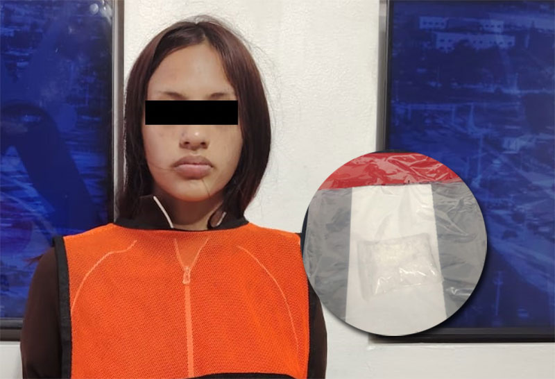 Razón por la cual fue abordada por protocolos de seguridad por lo que, al someterla a una inspección preventiva, le fue localizado entre sus prendas de vestir un envoltorio con cristal con un peso aproximado de 24 gramos, quedando en ese momento bajo detención.