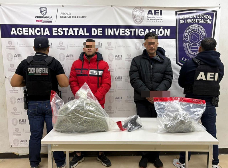 Elementos de la Agencia Estatal de Investigación, adscritos al Centro de Operaciones Estratégicas (COE), de la Fiscalía de Distrito Zona Norte, detuvieron a dos personas de nombres, Francisco Javier G. M. y Alfredo Alejandro O. S., por posesión ilegal de arma de fuego y delitos contra la salud, en la colonia Los Alcaldes, en Ciudad Juárez.