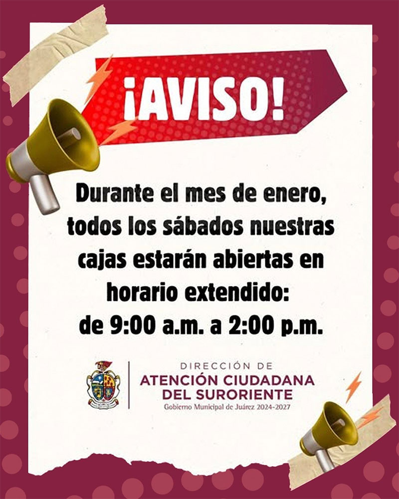 La Coordinación de Atención Ciudadana del Suroriente, ubicada en avenida Del Valle número 156 de la colonia Zaragoza, amplió sus días de servicio a la comunidad durante los sábados de enero, en horario de 9:00 de la mañana a las 2:00 de la tarde.