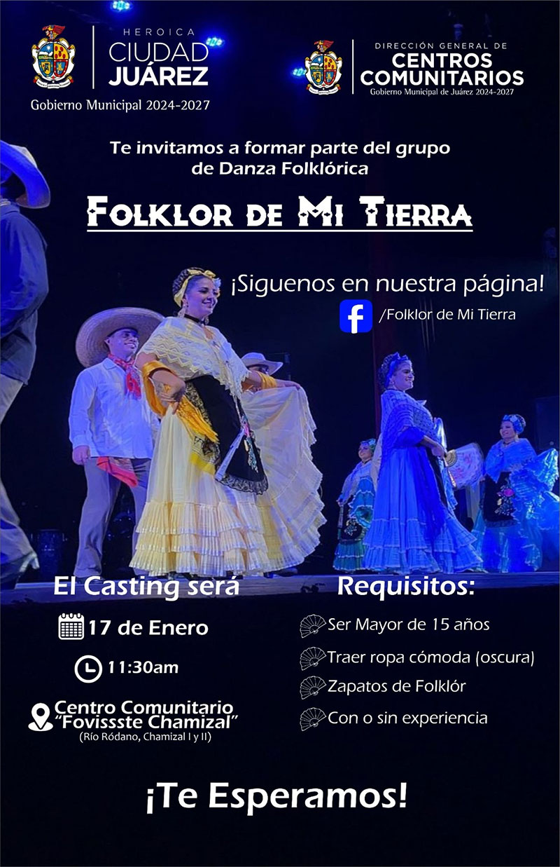 Con el firme compromiso de impulsar la cultura, preservar las tradiciones y fortalecer el tejido social, el Gobierno Municipal, a través de la Dirección General de Centros Comunitarios, invita a la ciudadanía a participar en el casting para formar parte de la Compañía de Danza “Folklor de Mi Tierra”.