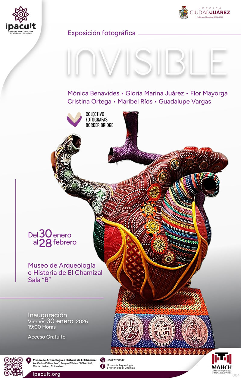 El Instituto para la Cultura del Municipio de Juárez (IPACULT) invita a la ciudadanía a la inauguración de la exposición fotográfica “Invisible”, una propuesta del Colectivo Fotógrafas Border Bridge, este viernes 30 de enero, a las 6:00 de la tarde, en el Museo de Arqueología e Historia de El Chamizal.