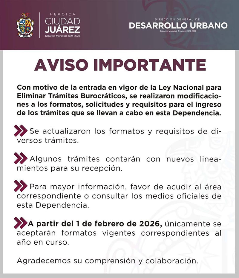 Con el objetivo de mejorar la atención a la ciudadanía, partir del 1 de febrero la Ventanilla Única de la Dirección General de Desarrollo Urbano aceptará únicamente formatos actualizados para la realización de trámites, como parte de los ajustes derivados de la entrada en vigor de la Ley Nacional para Eliminar Trámites Burocráticos.