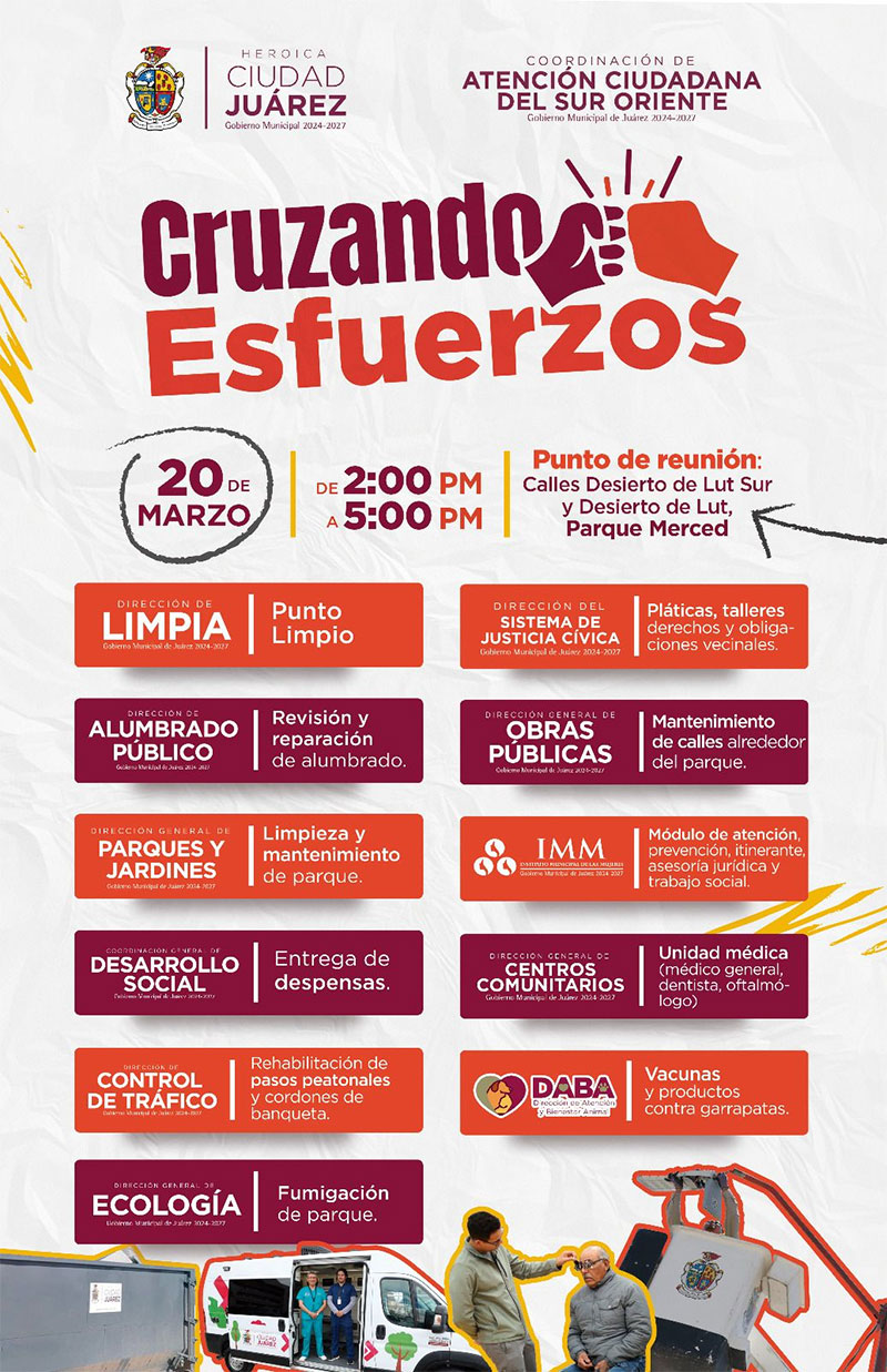 Con el objetivo de acercar los servicios de las dependencias municipales y mejorar las condiciones del entorno urbano, el Gobierno Municipal realizará la jornada “Cruzando Esfuerzos”, actividad programada para el próximo viernes 20 de marzo en el Parque Merced, ubicado en el cruce de las calles Desierto de Lut Sur y Desierto de Lut.