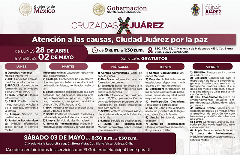 El próximo sábado 3 de mayo de 8:30 de la mañana a 1:30 de la tarde, se llevará a cabo la Cruzada por Juárez “Atención a las causas, Juárez por la Paz”, en el cruce de las calles Hacienda La Laborcita y Sierra Vista, en la colonia Sierra Vista.