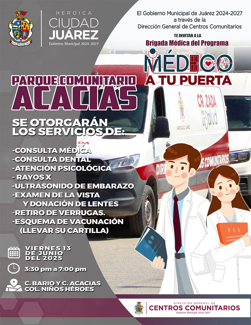 El Gobierno Municipal, a través de la Dirección General de Centros Comunitarios, llevará a cabo hoy una brigada del programa Médico a tu Puerta al Parque Comunitario Acacias, ubicado en la calle Bario y Acacias, en la colonia Niños Héroes.